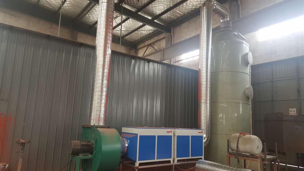 廢氣源集氣罩(搜集車間各個廢氣源的廢氣,接入主管道)噴淋吸收塔(吸收掉能溶于水的無機廢氣、粉塵以及顆粒物,降低廢氣溫度,為等離子提供優(yōu)良的運行環(huán)境)_低溫等離子處理設備(破壞廢氣分子結(jié)構(gòu),轉(zhuǎn)化為物質(zhì)) 高壓風機(高壓的吸力作用下將風抽出車間)凈化吸收塔(進一步吸收粉塵以及顆粒物以及一些無機氣體,水洗小分子碎片,利于檢測達標)煙囪高空排放(也可低空排放)。